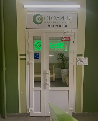 вхід до Медичної клініки «СТОЛИЦЯ» знаходитиметься праворуч від виходу з ліфта.